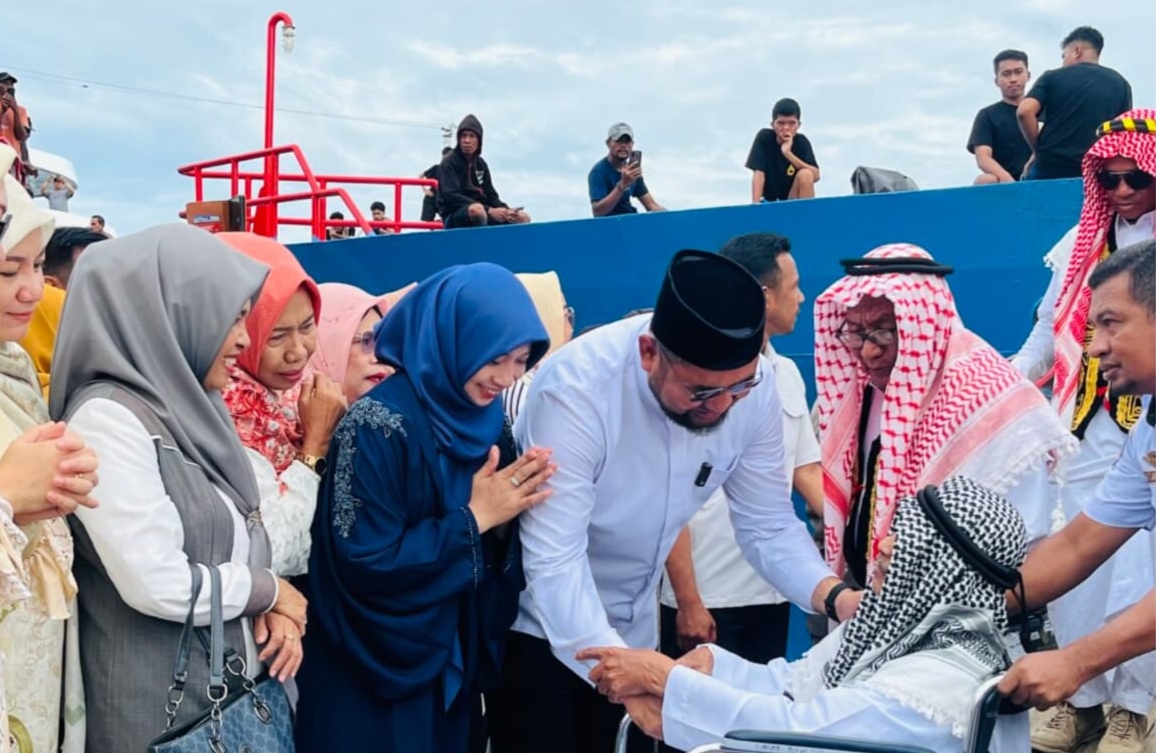 Para jamaah tiba di Pelabuhan Kupal menggunakan Kapal Sumber Raya 05, disambut meriah oleh unsur Forkopimda, Ketua TP PKK Halsel Ny. Rifa’at Al Sa’adah Bassam Kasuba, Ketua GOW Mardiana Bopeng, serta jajaran pejabat daerah.