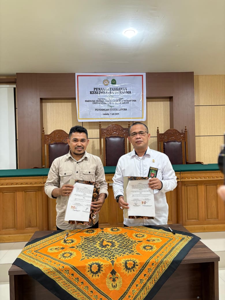 Penandatanganan MoU dilakukan langsung oleh Ketua PN Labuha, Bapak WahyudinSyah Panjaitan, SH., M.Hum., dan Ketua Program Studi Hukum Fakultas Inovasi Pendidikan dan Humaniora UNSAN Bacan, Bapak Suwarjono Buturu, SH., MH.